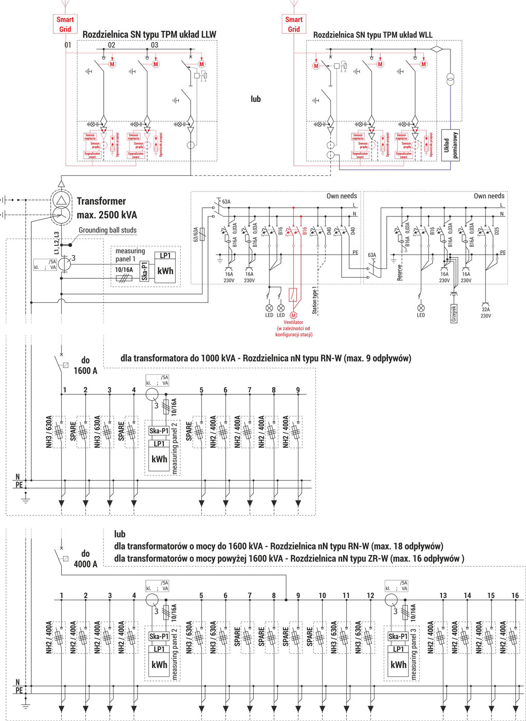 Детальний вибір розподільних пристроїв СН та їх аксесуарів можна знайти в розділах, присвячених окремим пристроям каталогу. Можливість встановлення інших типів та конфігурацій розподільних пристроїв, щоразу слід консультуватися з виробником підстанції.